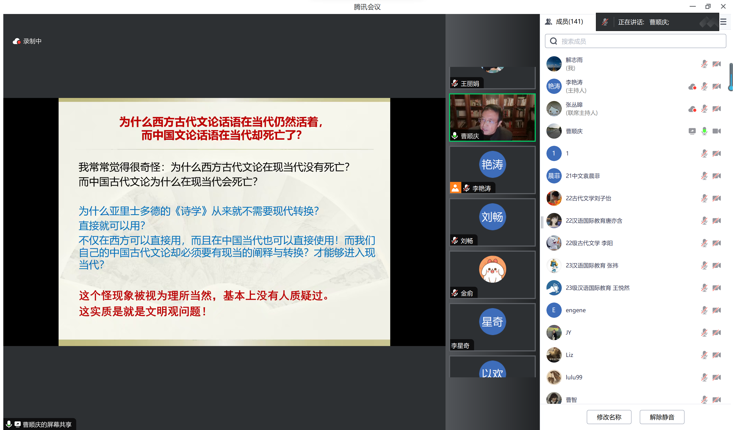 2023年11月20日晚,四川大学杰出教授(院士待遇)、文学与新闻学院学术院长,欧洲科学与艺术院院士,国批博士生导师(1993),教育部重大人才项目特聘教授,比较文学学会第四任会长,国家社科基金评委曹顺庆教授在腾讯会议为我院师生带来题为“重塑文明观,建构中国话语”的学术讲座。讲座由球友会在线平台(中国)官网暨新闻与传播学院院长张丛皞主持,线上的诸多学子参加了此次讲座。