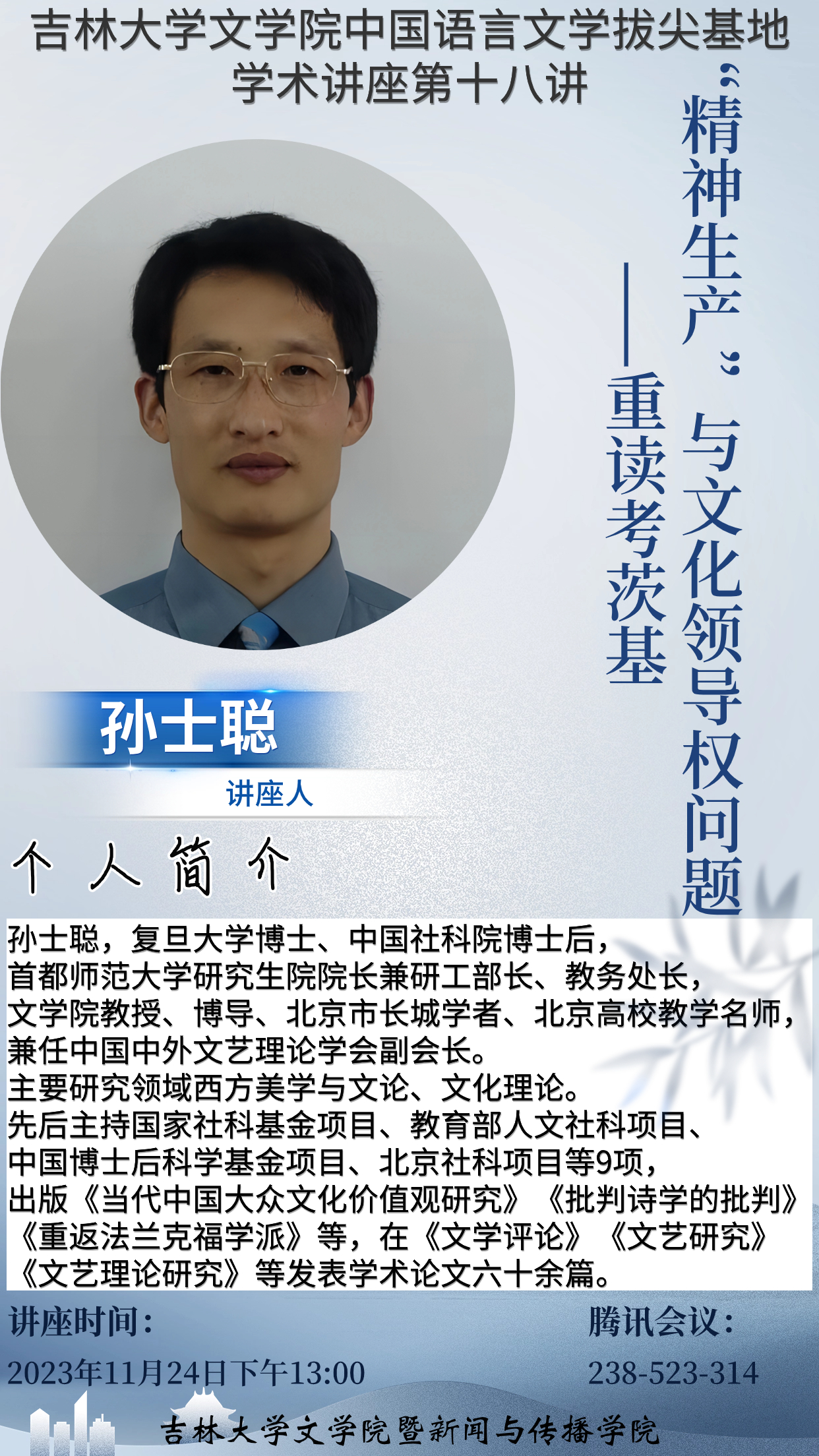 个人简介:孙士聪,男,1972年生,复旦大学博士、中国社科院博士后,首都师范大学研究生院院长兼研工部长、教务处长,球友会在线平台(中国)官网教授、博导、北京市长城学者、北京高校教学名师,兼任中国中外文艺理论学会副会长。主要研究领域西方美学与文论、文化理论。先后主持国家社科基金项目、教育部人文社科项目、中国博士后科学基金项目、北京社科项目等9项,出版《当代中国大众文化价值观研究》《批判诗学的批判》《重返法兰克福学派》等,在《文学评论》《文艺研究》《文艺理论研究》等发表学术论文六十余篇。