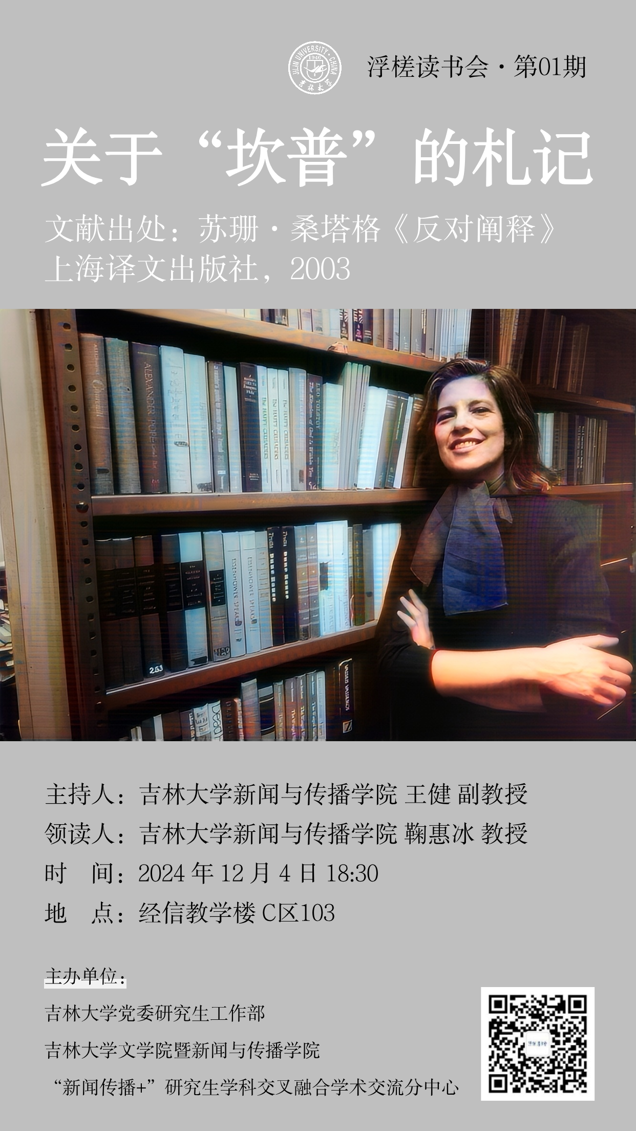 为进一步加强当代传媒学生的审美判断力与文化洞察力,提升其在新时代背景下的创新能力与批判性思维。现决定联合浮槎读书会,特别策划一期以“讨论坎普,就是出卖坎普——苏珊·桑塔格《关于‘坎普’的札记》导读”为主题的读书会。具体事项通知如下: