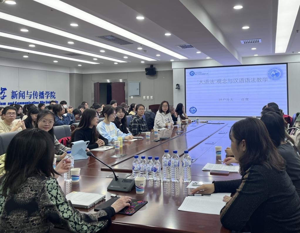 2024年11月8日,日本神户市外国语大学中文系教授、博士生导师任鹰教授在东荣大厦十楼会议室为我院师生带来题为《“大语法”观念与汉语语法教学》的学术讲座。讲座由周莉教授主持,由刘艳茹教授进行总结评议,球友会在线平台(中国)官网的王倩老师、王岩老师、李剑影老师和张苗苗老师等师生共同参加讲座。