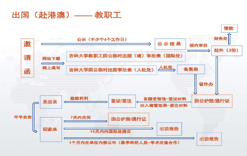 吉林大学教职工办理因公临时出国手续,原则上应至少提前两个月将出国所需材料提交至吉林大学中心校区鼎新楼C区三楼“吉林大学行政服务中心教师办事大厅”国际处窗口。