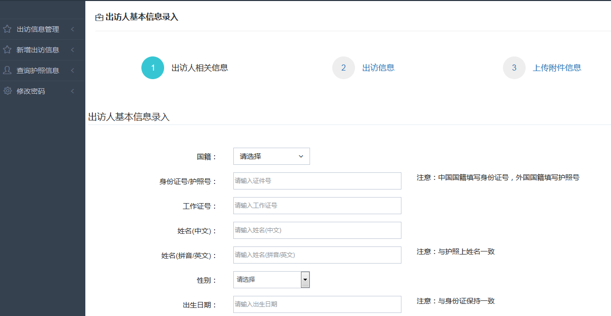 3.  登录成功后,在“新增出访信息”栏目下填写出访人相关信息、出访信息、上传附件信息并提交。