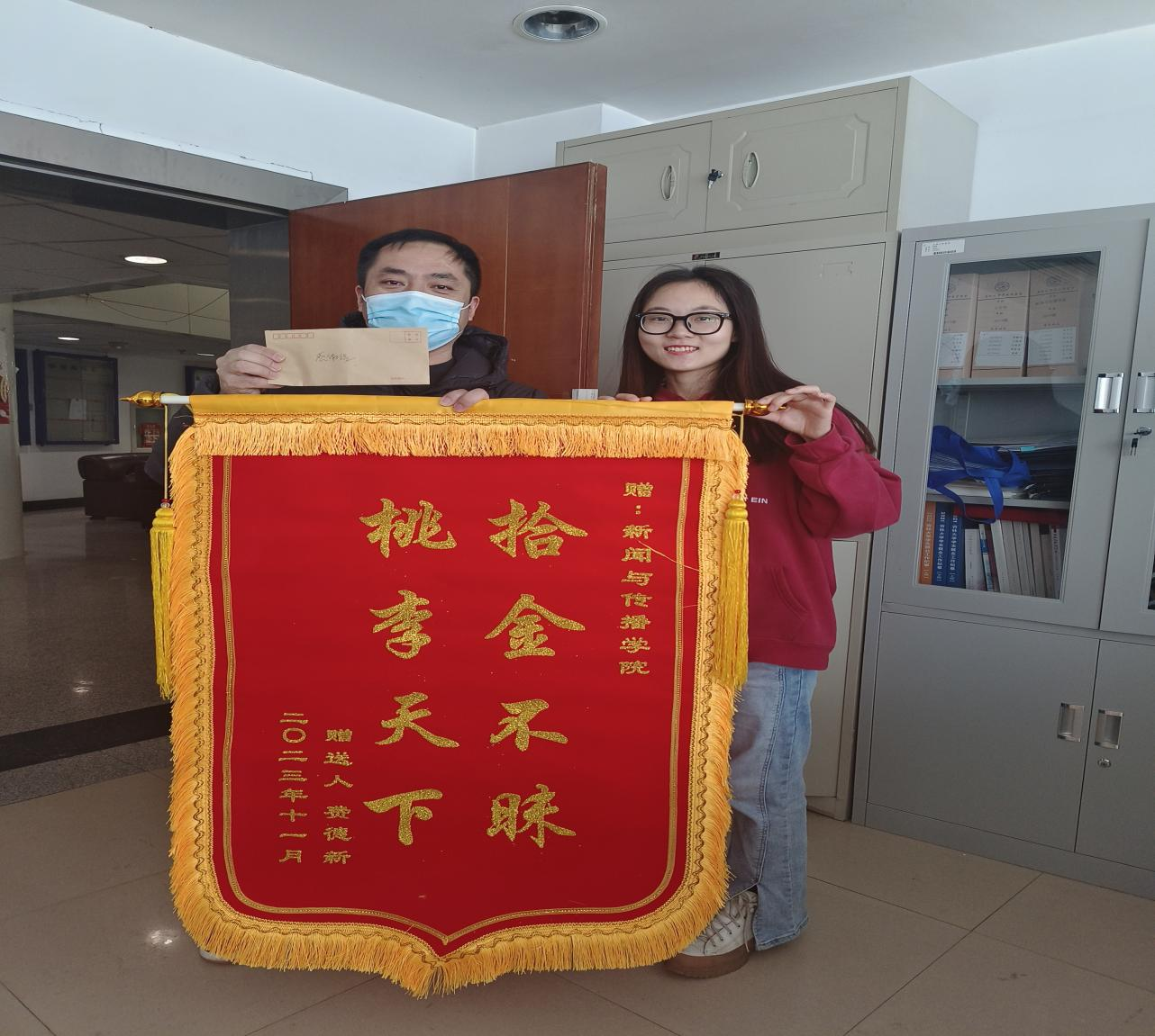 2023年11月25日,我院2021级新闻学专业刘邢同学在学校附近捡到一个装有银行卡、身份证、现金两千余元,各种票据数张的钱包。她第一时间用钱包中的名片联系到失主,将钱包归还。