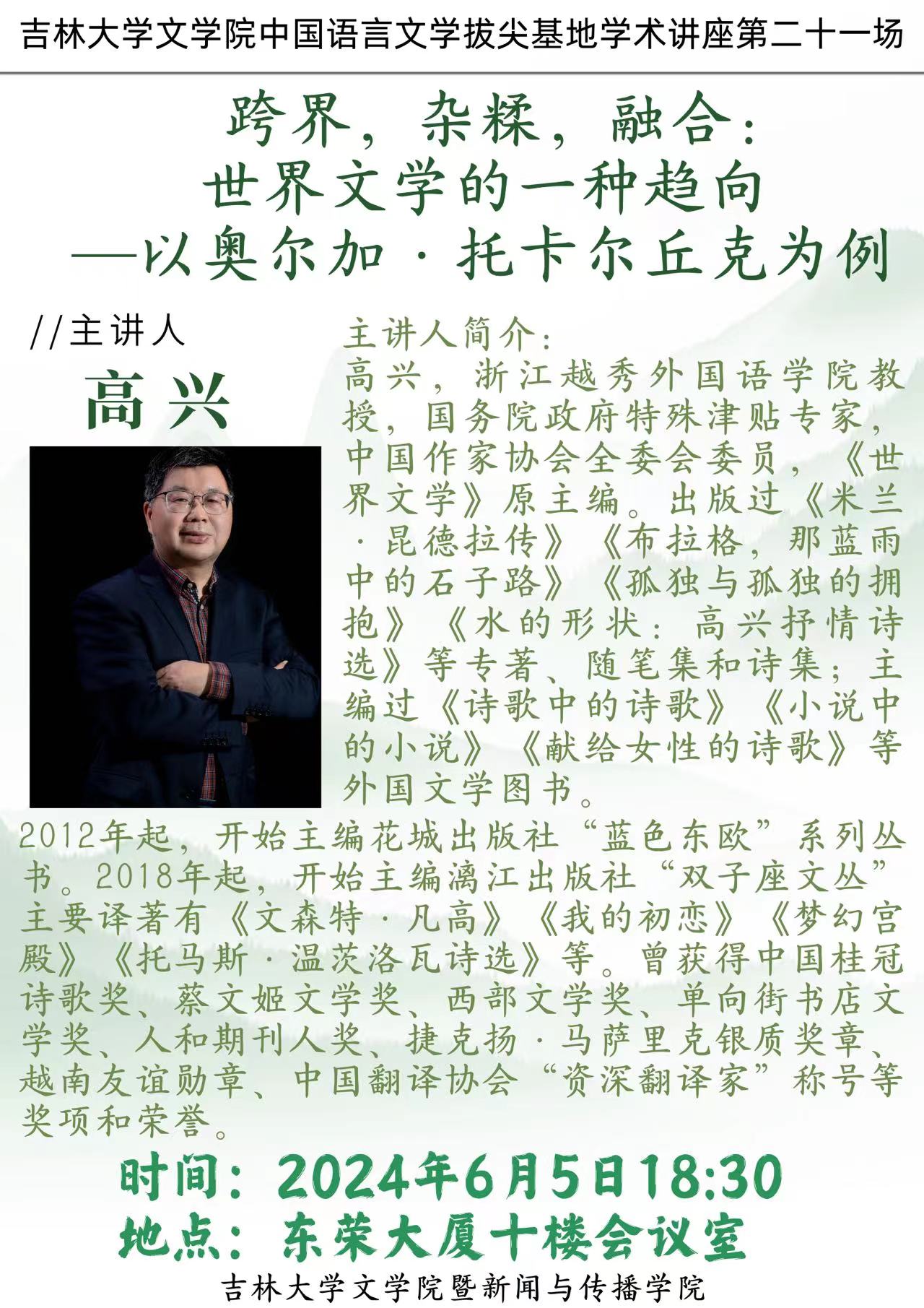 6月5日,原中国社会科学院外国文学研究所研究员、《世界文学》主编,著名东欧文学研究专家、翻译家、作家,浙江越秀外国语学院高兴教授在东荣大厦十楼会议室为我院师生带来题为《跨界,杂糅,融合:世界文学的一种趋向———以奥尔加·托卡尔丘克为例》的学术讲座。讲座由外国文学教研室杨富波副教授主持。
