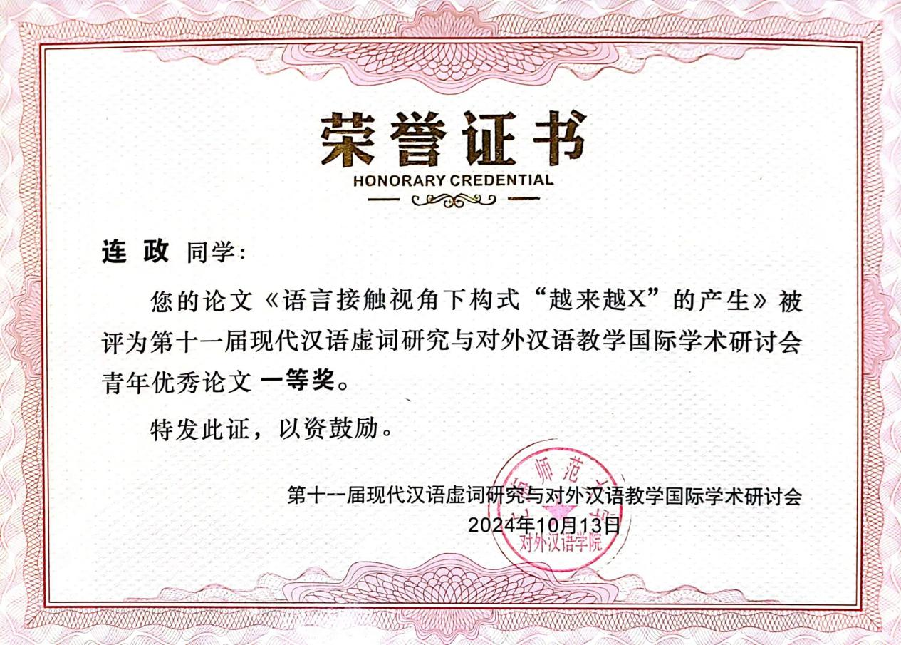 2024年10月13日,在第十一届现代汉语虚词研究与对外汉语教学国际学术研讨会上,我院23级语言学及应用语言学硕士研究生连政的论文《语言接触视角下构式“越来越X”的产生》荣获“青年优秀论文一等奖”。