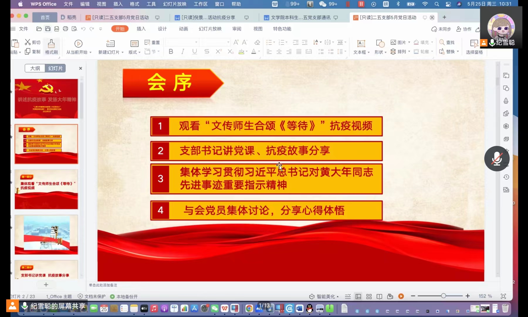 在过去的两年里,中国共产党团结带领全国各族人民,进行了一场惊心动魄的抗疫大战,经受了一场艰苦卓绝的历史大考,取得了抗击新冠肺炎疫情斗争的重大战略成果,创造了人类同疾病斗争史上的又一个英勇壮举。正是在这场殊死较量中,中国人民和中华民族谱写了一段可歌可泣的抗疫史诗,铸就了“生命至上、举国同心、舍生忘死、尊重科学、命运与共”的伟大抗疫精神。对此,按照学校要求,球友会在线平台(中国)官网本科生第二、第五党支部于2022年5月25日上午10:30在腾讯会议开展“讲述抗疫故事,发扬大年精神”主题党日活动。会议由第二党支部书记曲昭琦和第五党支部书记王振彰组织召开,支部全体党员、2022年第一期新闻与传播学院发展对象参加会议。