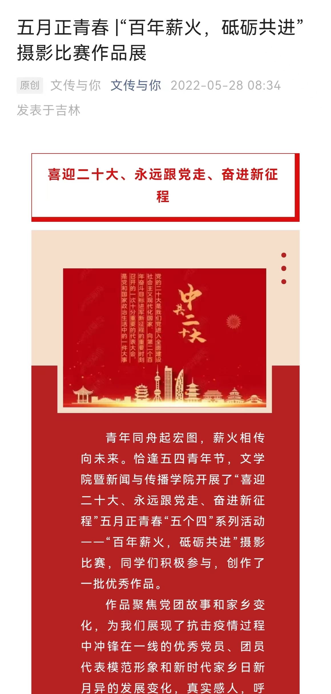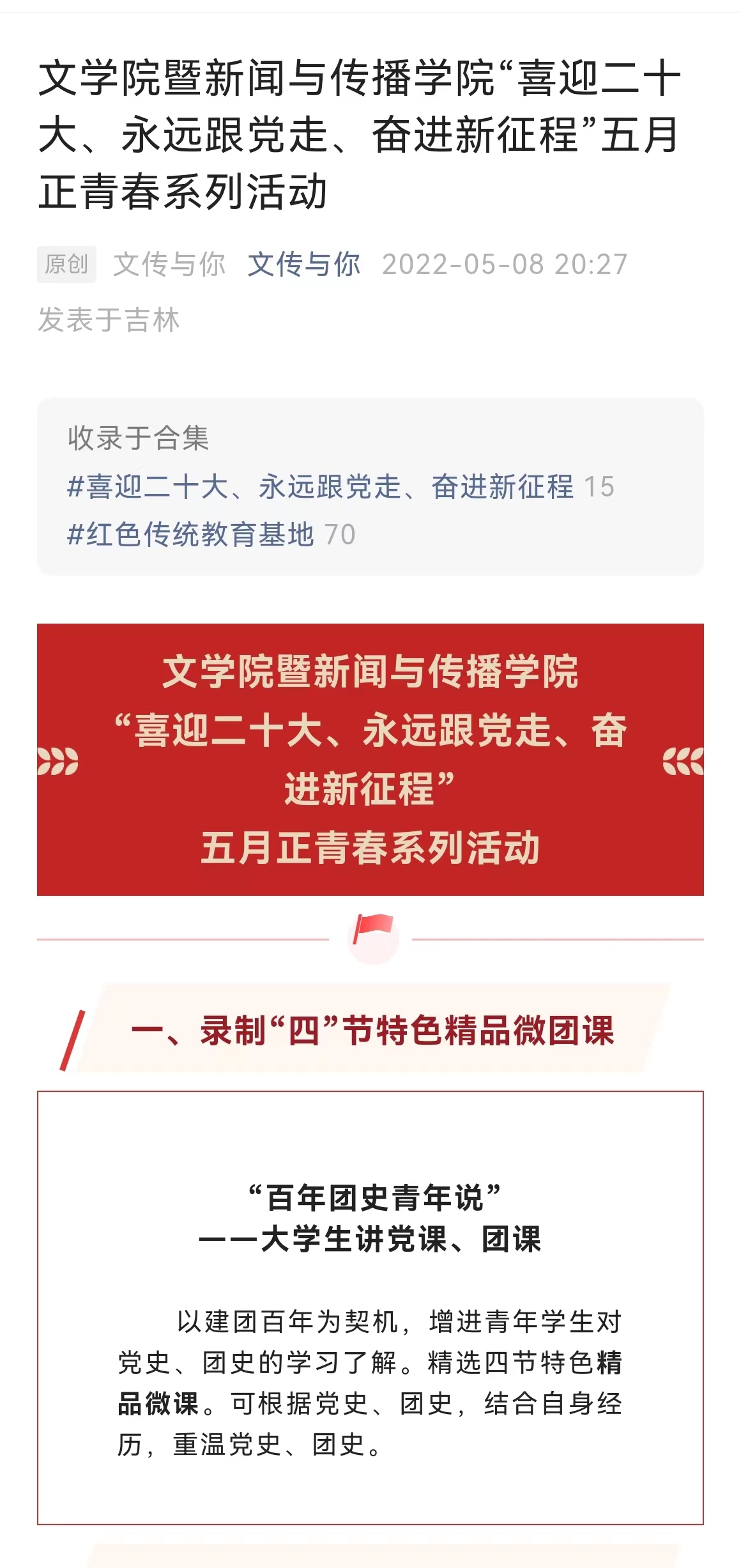 为庆祝中国共青团成立一百周年,贯彻落实党中央关于党团史学习教育的决策部署,球友会在线平台(中国)官网暨新闻与传播学院开展“喜迎十二大,永远跟党走,奋进正青春”五月正青春,五个“四”系列活动,活动得到学院师生的积极响应。