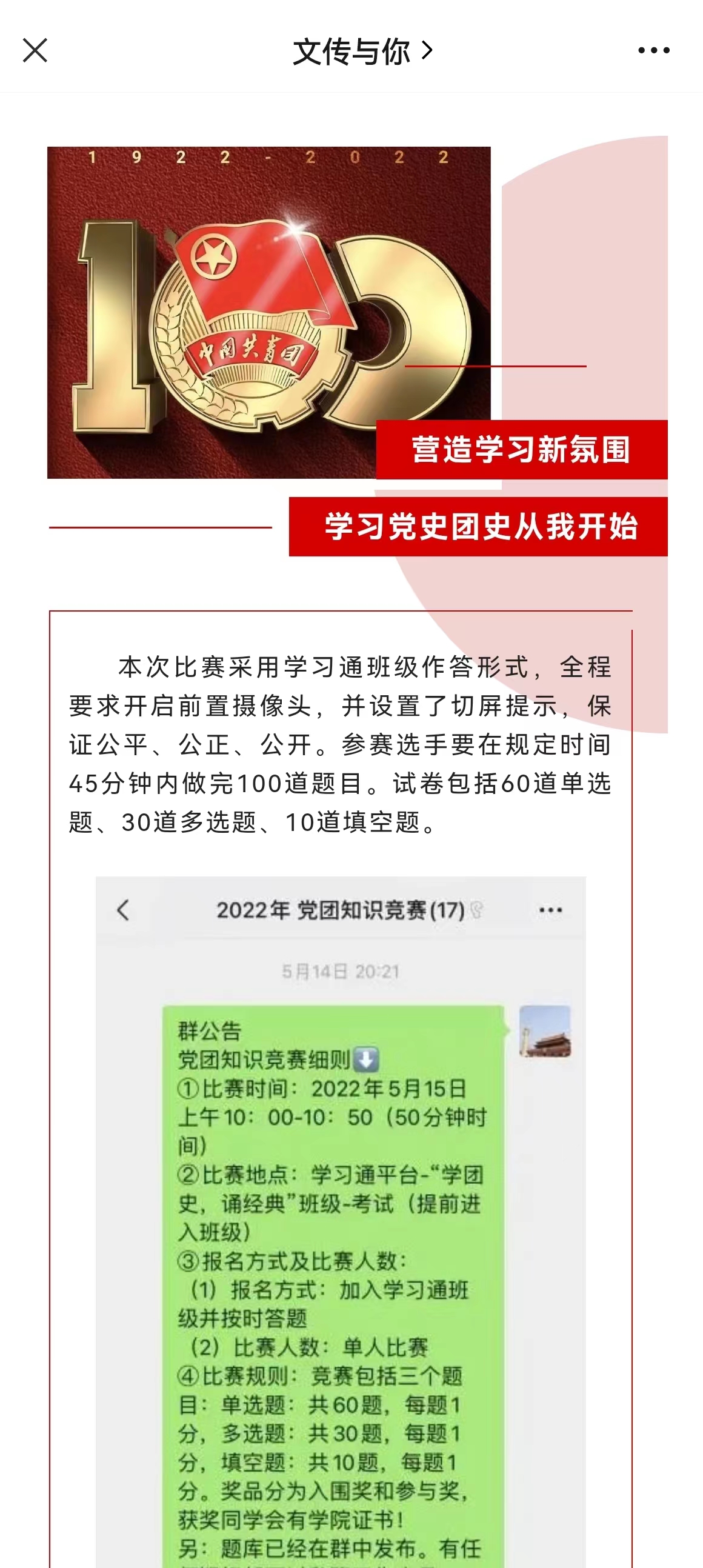 “叙说团学故事,献礼建团百年”活动。本次活动中,同学们讲述自己在团学期间亦或是参与团学活动的难忘场景,记录个人成长历程,一段段音频和视频反映了同学们不同时期的精神风貌,展现了青年的担当。相信在未来的日子里,同学们会继续勇担使命,勇往直前。