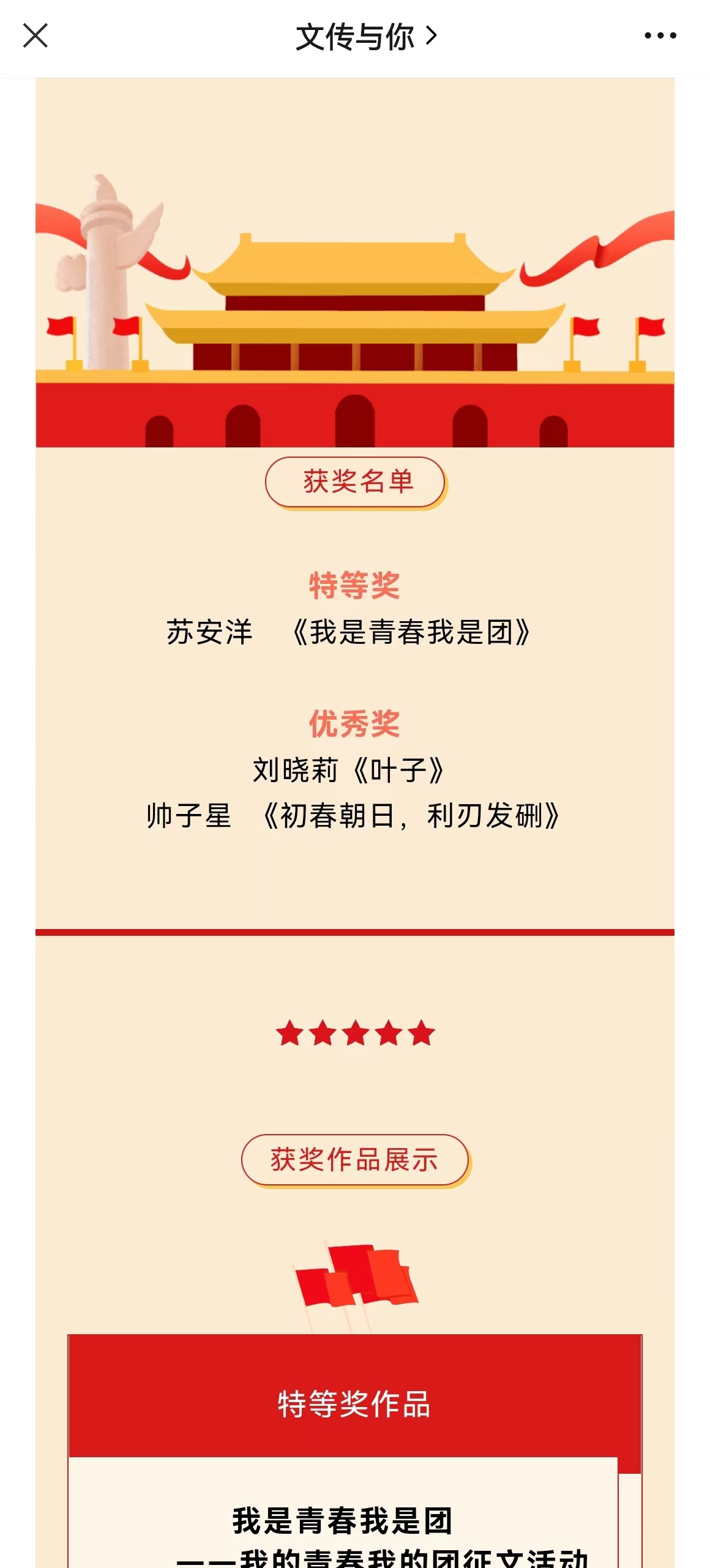 “四”类比赛均圆满收官。2022年5月15日上午10时,团学组织生活保障部举行了“学党史,诵经典”团史知识竞赛活动,各位选手比赛前根据所给材料充分准备,比赛时认真作答,最终共14名同学获得荣誉;在“我的青春我的团”征文比赛中,同学们积极投稿,书写与吉大共青团的故事,讲述自己与吉大共青团的青春回忆,表达爱国热情和爱团热忱,经评比,最终苏安洋同学的作品《我是青春我是团——我的青春我的团征文活动》获得特等奖、刘晓莉同学的作品《叶子——致吉大共青团》获得优秀作品奖、帅子星同学的作品《初春朝日 利刃发硎——我的党团故事》获得优秀奖;在“百年薪火,砥砺共进”摄影比赛中,同学们围绕党员故事主题和家乡变化主题创作出了一批优秀的作品,展现出抗击新冠疫情过程中冲锋在前线的优秀党员、团员代表模范形象和新时代家乡日新月异的发展变化,呼吁我们砥砺共进,走向新征程;在“五四精神,传承有我”视频大赛中,同学们通过视频制作形式展示建设祖国的伟大成就和广大青年不畏艰险、积极向上的精神风貌。