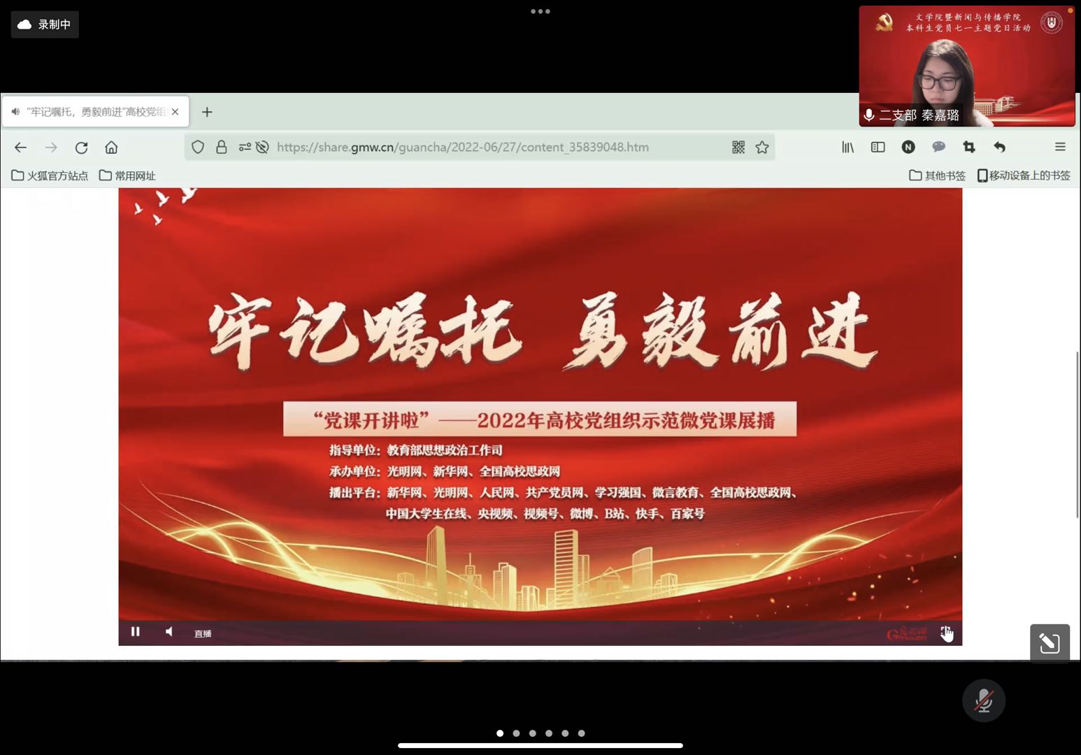 活动第二项,共同观看党课。全体与会党员在线上共同观看“牢记嘱托,勇毅前进”2022年高校组织示范微党课。通过观看四所高校党委书记和师生代表的发言,在围绕着贯彻习近平总书记考察学校重要讲话和给学校师生的重要回信的讲述中,学习了解扎根中国大地,厚植爱党爱国情怀,培养可堪大任的时代新人的深刻内涵。
