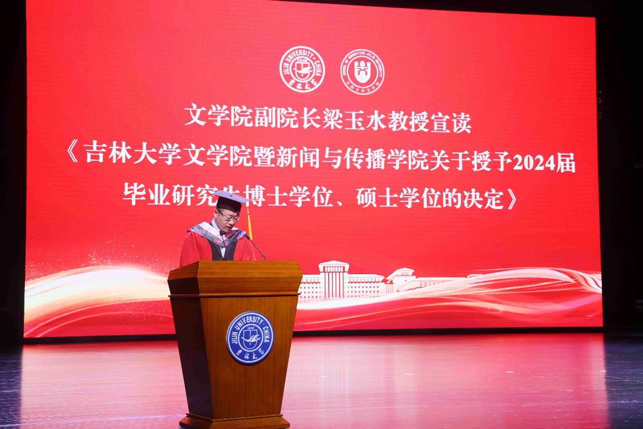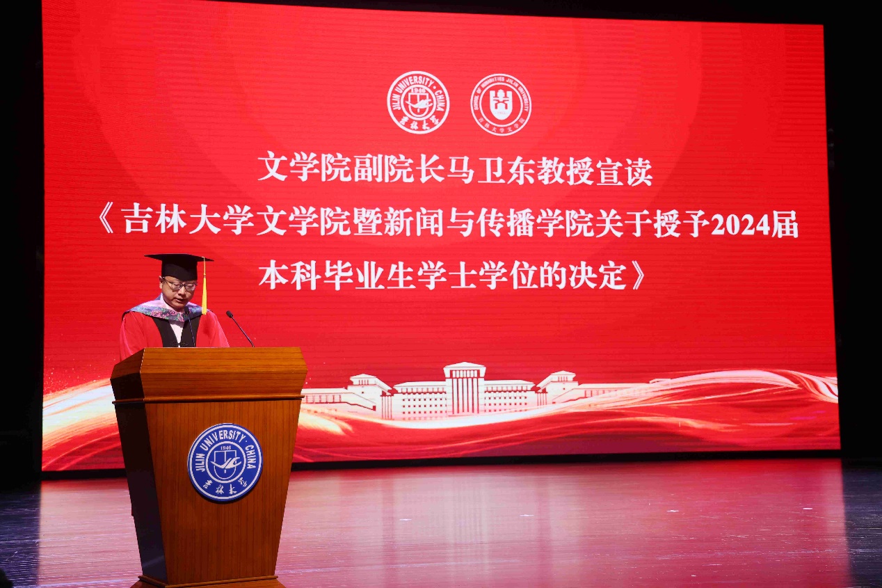 接着,球友会在线平台(中国)官网副院长梁玉水教授宣读了《球友会在线平台(中国)官网暨新闻与传播学院关于授予2024届毕业研究生博士学位、硕士学位的决定》,球友会在线平台(中国)官网副院长马卫东教授宣读了《球友会在线平台(中国)官网暨新闻与传播学院关于授予2024届本科毕业生学士学位的决定》,主礼教授为全体获得学位的学生拨穗。学位帽的流苏轻轻拨过,不仅标志着一段学习旅程的圆满落幕,也意味着人生新阶段的启航。