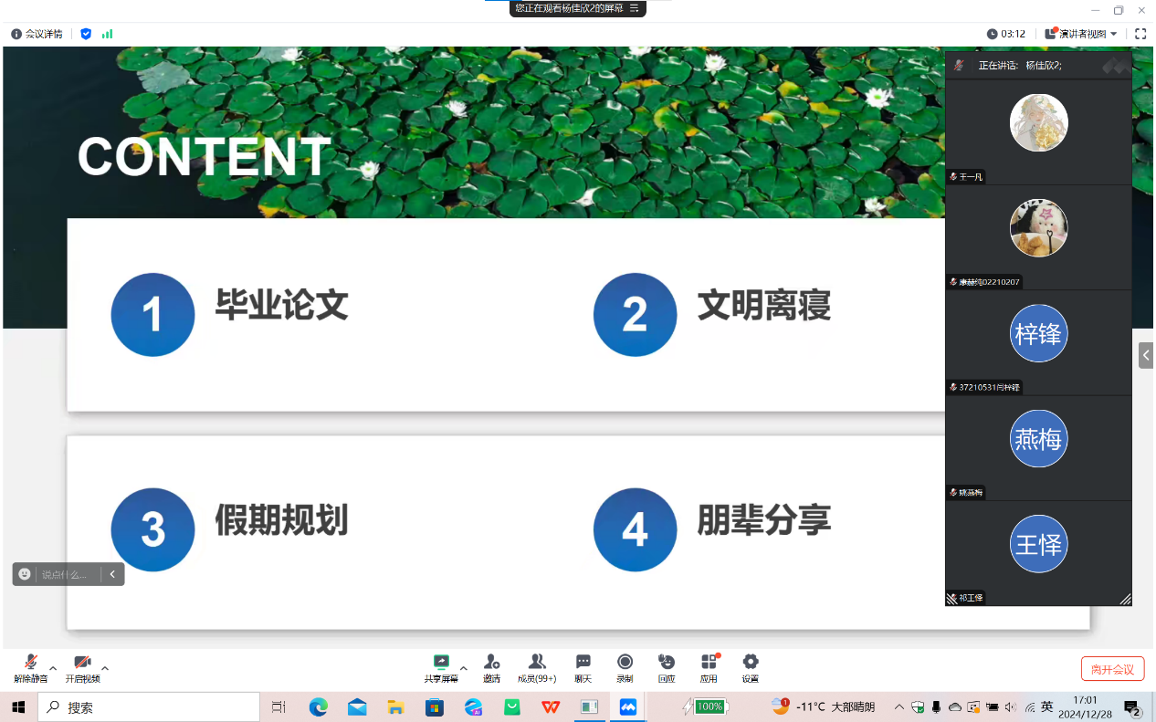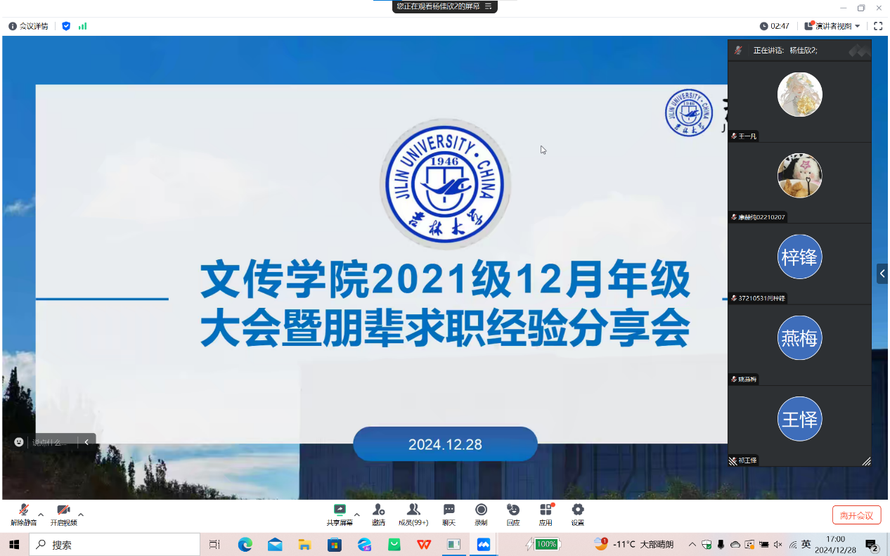 2024年12月28日下午五时,球友会在线平台(中国)官网暨新闻与传播学院在寒假前夕以线上形式召开了年级大会暨朋辈就业经验分享会,会议由辅导员杨佳欣老师主持,全体大四学生参加了此次大会。会议内容涵盖了毕业论文、文明离校、假期规划以及求职经验分享四个方面,为同学们即将到来的寒假生活和未来职业规划提供了宝贵的指导和建议。