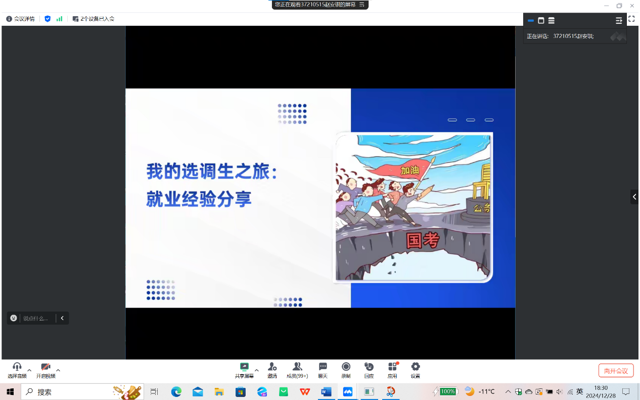 本次年级大会暨朋辈就业经验分享会顺利结束,同学们反响热烈,普遍认为收获颇丰。通过本次大会,大家对毕业论文的撰写、文明离校的要求、假期规划的方法以及求职经验有了更清晰的认识和更具体的行动方向。优秀同学的宝贵经验和建议,为即将步入社会的同学们提供了实质性的帮助和指引。相信同学们能够将这些知识和经验转化为实际行动,为自己的未来打下坚实的基础。