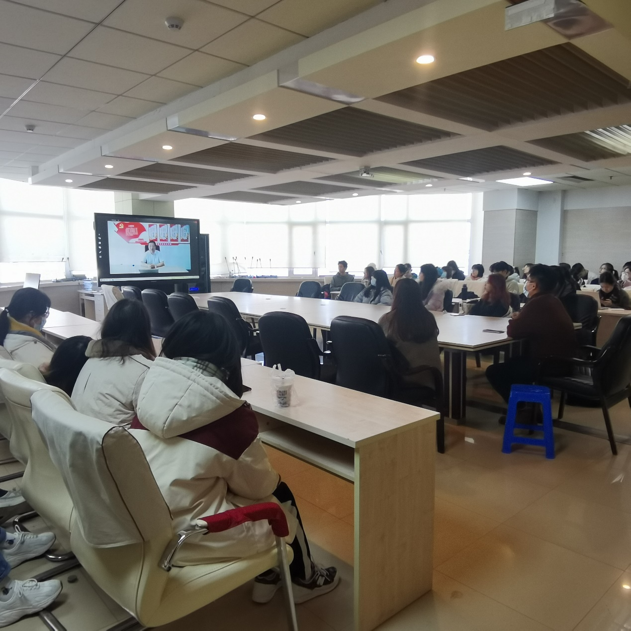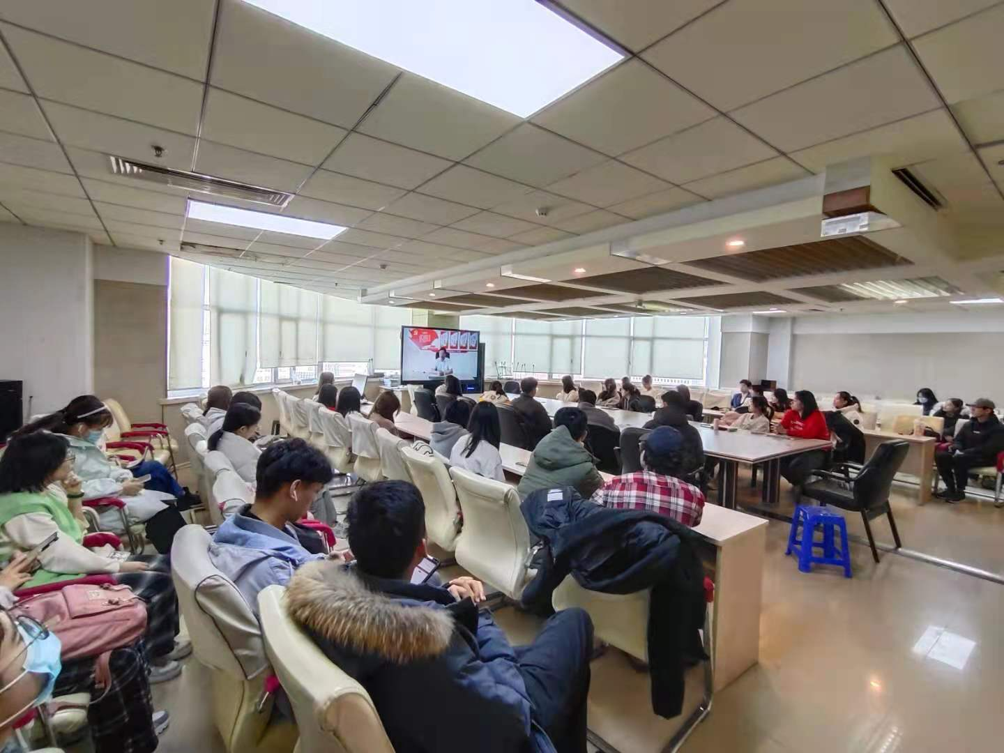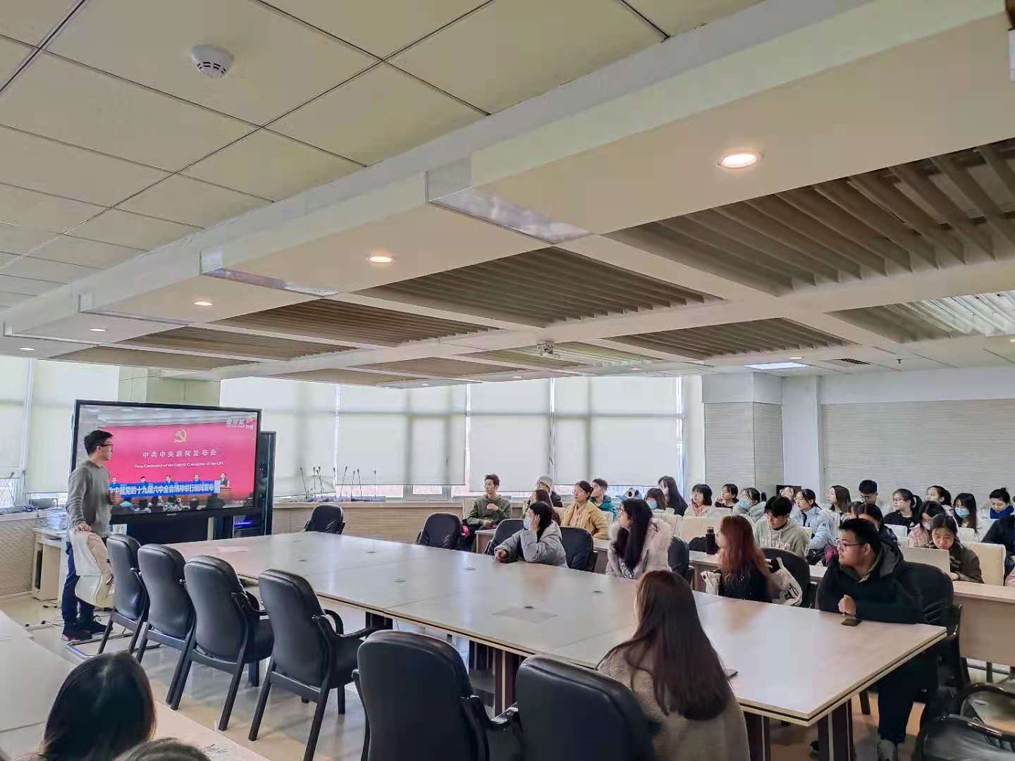 课堂教学培训分为两场进行,团委负责人于航老师带领同学们集体观看了“十九届六中全会新闻发布会”。在新闻发布会上,中央宣传部分管日常工作的副部长王晓晖,中央政策研究室主任江金权,中央财经委员会办公室分管日常工作的副主任韩文秀,中央党史和文献研究院院长曲青山介绍党的十九届六中全会精神,并围绕全会的重要成果进行权威解答。观看后,于航老师强调了十九届六中全会关乎每一位同学,要更加自觉地增强“四个意识”、坚定“四个自信”、做到“两个维护”,履行青年应尽的责任和义务。同学们在观看后围绕"十九届六中全会精神"的内容记录笔记、展开讨论。