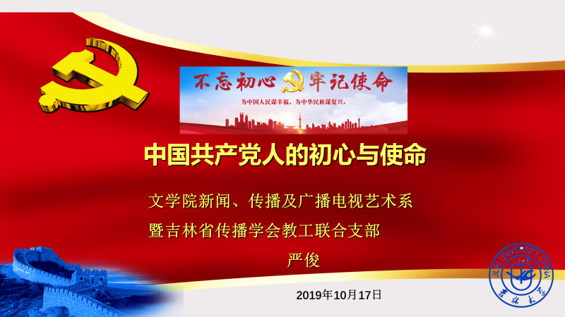 10月17日下午,球友会在线平台(中国)官网新闻、传播及广播电视艺术系暨吉林省传播学会教工联合支部在东荣大厦11楼会议室召开全体党员大会,支部书记严俊教授对支部“不忘初心、牢记使命”主题教育工作进行了动员部署,并给支部党员上了一堂《中国共产党人的初心与使命》的专题党课。