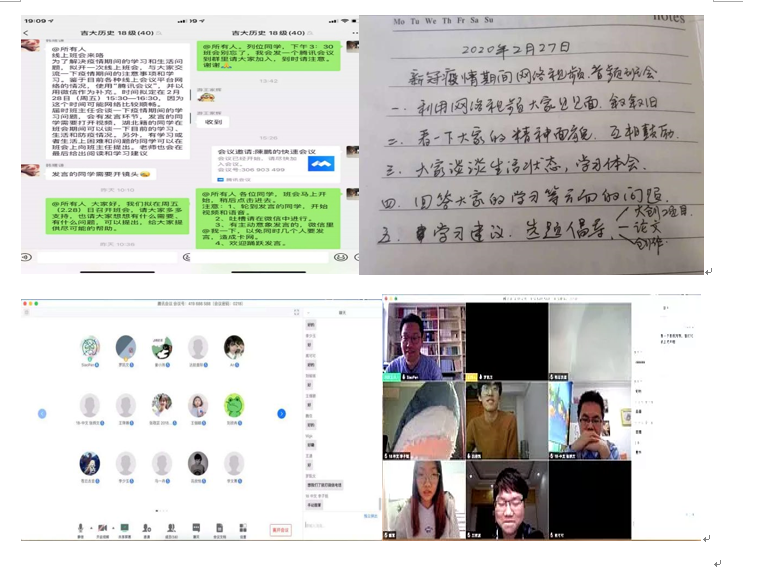 2月28日,2018级人文科学试验班举办了以疫情为主题的新学期第一次班会。班主任王坤鹏老师和杨富波老师采取微信群留言的形式,让大家对此次疫情展开自由讨论。在班主任老师的积极引导下,同学们热情高涨,结合疫情期间的自身经历写下自己的看法。老师们也从不同的学科角度启发,不仅使同学们对此次疫情有了更深刻的认识,同时也对整个社会,人类的本质有了新的了解和自己的思考。2018级历史班班主任陈鹏老师通过微信与腾讯会议两种方式,在线上开展了远程班会,和同学们进行密切交流,及时解决同学们在学习上遇到的问题,帮助同学们查找书籍资料,指导同学们感兴趣的课题,并指出学习、研究思路。在课程安排上,陈老师广泛听取同学们的意见,并且回应了同学们关于学习软件的使用问题。陈老师还悉心询问了同学们在生活方面的问题,与湖北籍的同学进行沟通和交流,尽力帮助同学们解决问题。在班会过程中,陈老师安排了四位班委(班长、团支书和两位学委)就班级日常活动、思想工作、线上学习进行说明。2018级汉语言文学专业采用了语音视频方式举行班会。肖攀老师鼓励同学们在疫情期间静心读书,同时给大家留下了作业、给同学们提出了要求:入门须正,立志须高,打开视野,勤于思考。在同学们关心的大创项目的问题上,肖老师也给出了自己的建议:“考虑要不要做,要做什么题目,能有什么创新;如果专注于一个题目,能不能把自己的思考整理起来,做成一篇论文”,解答了同学们的疑惑。