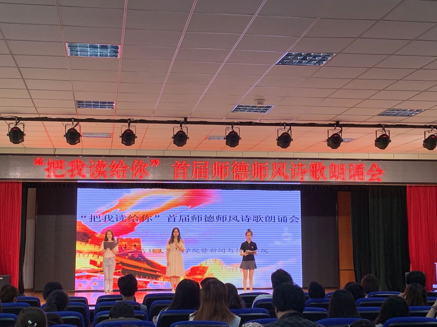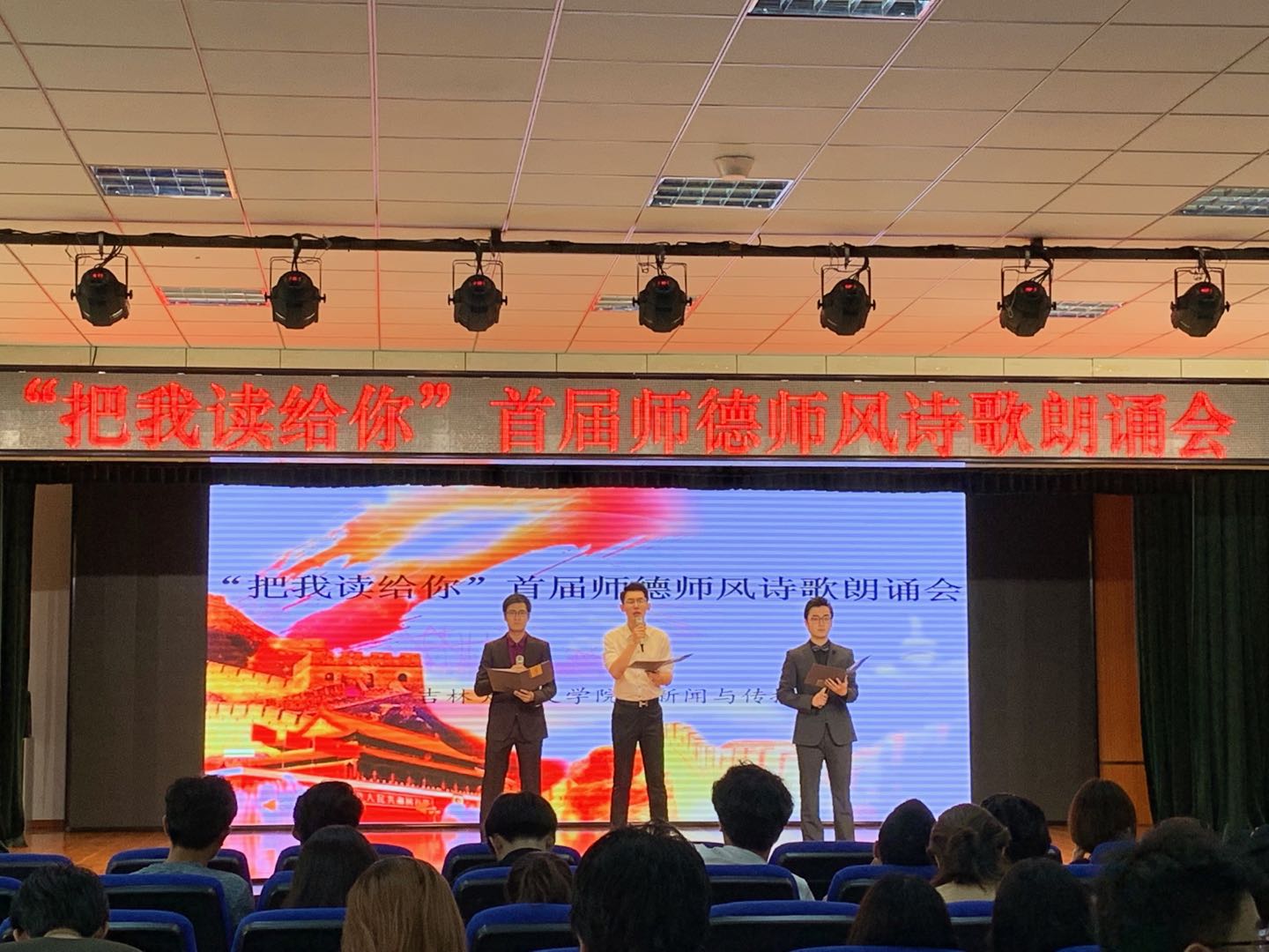 本次朗诵会以弘扬师德师风为主题,选取多部当代教师主题朗诵作品,内容丰富,角度多元,表演精彩纷呈:由龚璟璐和贾培峰同学带来的作品《幸福》以夹唱夹诵形式带来别开生面的开场,带动了现场的气氛;李嘉奇、王贺民和赵中原同学奉上了《所有的人,为一个人感动》三人配乐诗朗诵,赞颂了时代楷模黄大年老师“心有大我 志诚报国”的精神意志,他们深情的朗诵勾起了同学们对黄老师的深切怀念,现场时时响起热烈掌声;徐滋遥、龚璟璐、庄璐和谢诺娅两组同学用《第十一位教师》、《老师》的朗诵为现场观众展现了山村教师无私奉献、舍己为人的高尚品德;沈珈伊、姜艺童、杨淇淇同学献上《给老师的一封信》,配合现场手语的表演,生动展现了作品中的残疾学生对老师的喜爱与认可;张儒硕和王荷樱子同学以《中国的声音》双人诗朗诵畅叙了老一辈播音员教师对祖国的忠诚与奉献,两人精彩的表现也再次将朗诵会推向高潮。最后,张芳馨老师对朗诵者的现场表现做了精彩点评,朗诵会也在观众们的热烈掌声中走向尾声。